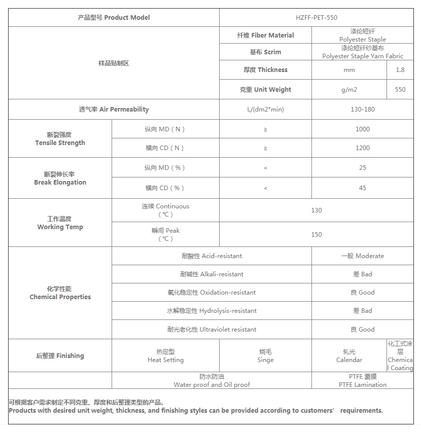 滌綸是聚酯纖維的商品名。我公司采用滌綸短纖維經針刺加固和熱定型制成的過濾氈,具有表明光滑平整,結構穩定,透氣性好,容易清灰等特點。該產品可以在130℃下長時間使用,在150℃下短時間加熱引起的強度損失可以恢復。經拒水防油,覆膜,防靜電和涂層等功能化后處理,滌綸過濾氈的性能進一步提高,具有防止糊袋,提高過濾精度,防止粉塵爆炸,延長使用壽命等效果。